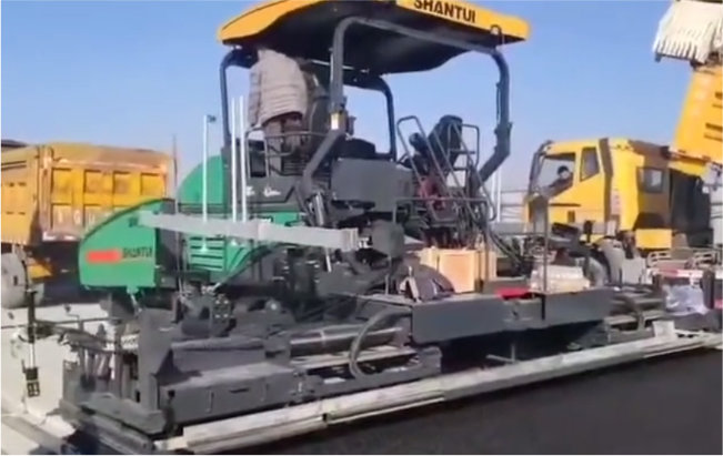 山推9米液壓伸縮攤鋪機助力山東某縣道建設,道路瀝青施工,攤鋪厚度為3cm,攤鋪寬度為7.5m,與某進口品牌攤鋪機雙機聯鋪,同臺競技,在作業質量、作業效率、操縱方式等方面,客戶非常滿意。